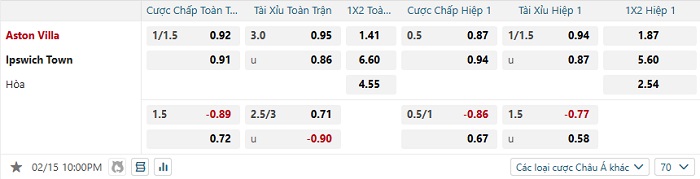 Tip kèo Châu Á full trận Aston Villa vs Ipswich