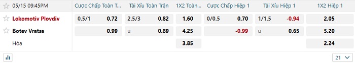 Tip kèo Châu Á hiệp 1 Lokomotiv Plovdiv vs Botev Vratsa