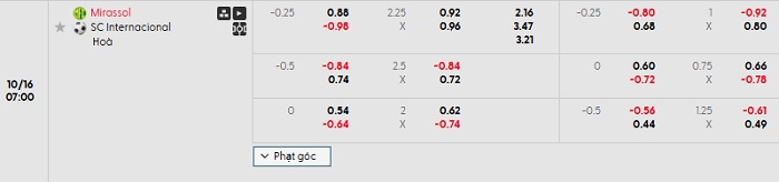 Tip kèo Châu Á full trận Mirassol vs Internacional