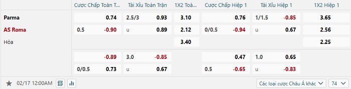 Tip kèo Châu Á full trận Parma vs AS Roma