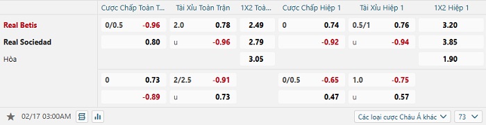 Tip kèo Châu Á full trận Real Betis vs Real Sociedad