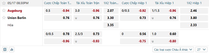 Tip kèo Châu Á full trận Augsburg vs Union Berlin