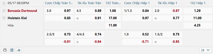 - Dự đoán tỷ số hiệp 1: Dortmund 1 – 0 Holstein Kiel
