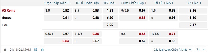 Tip kèo Châu Á hiệp 1 Roma vs Genoa