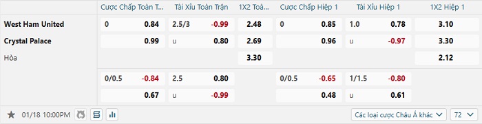 Tip kèo Châu Á full trận West Ham vs Crystal Palace