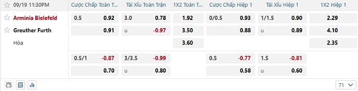 Tip kèo Châu Á hiệp 1 Arminia Bielefeld vs Greuther Furth