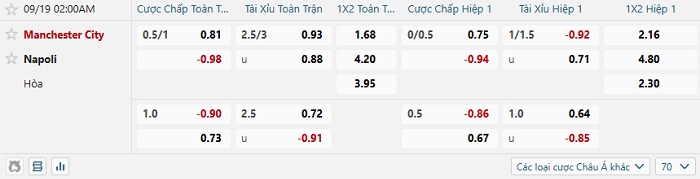 Tip kèo Châu Á hiệp 1 Man City vs Napoli
