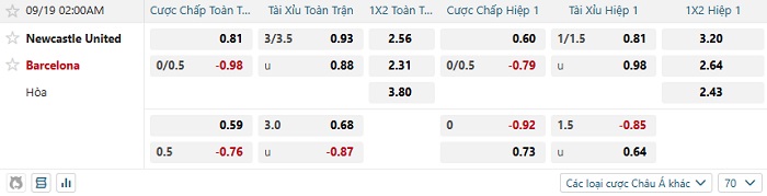 Tip kèo Châu Á full trận Newcastle vs Barcelona