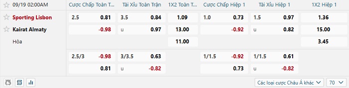 Tip kèo Châu Á full trận Sporting Lisbon vs Kairat Almaty