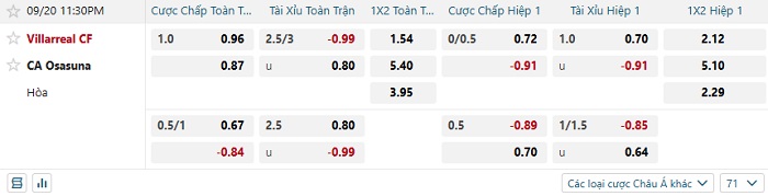 - Dự đoán tỷ số hiệp 1: Villarreal 1 – 0 Osasuna