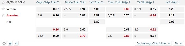 Tip kèo Châu Á hiệp 1 Verona vs Juventus