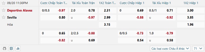 Tip kèo Châu Á hiệp 1 Alaves vs Sevilla