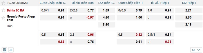 Tip kèo Châu Á full trận Bahia vs Gremio