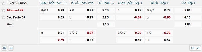 Tip kèo Châu Á hiệp 1 Mirassol vs Sao Paulo
