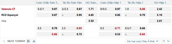 Tip kèo Châu Á hiệp 1 Valencia vs Espanyol