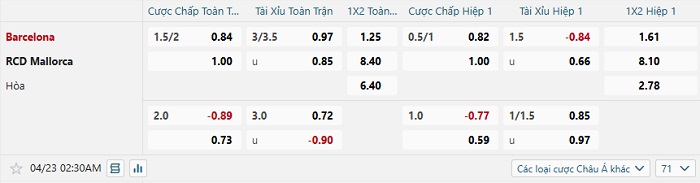 Tip kèo Châu Á full trận Barcelona vs Mallorca