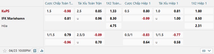 Tip kèo Châu Á hiệp 1 KuPS vs Mariehamn