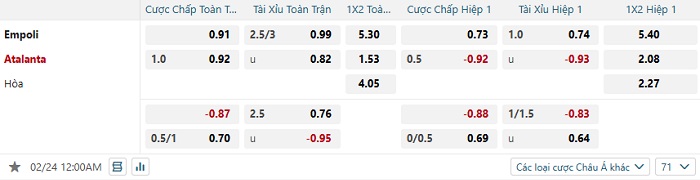 Tip kèo Châu Á full trận Empoli vs Atalanta