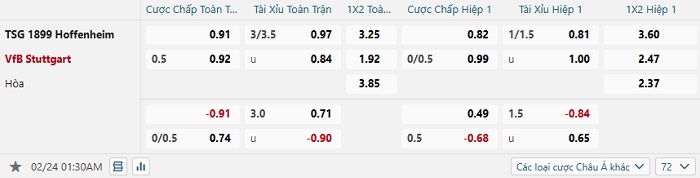 Tip kèo Châu Á hiệp 1 Hoffenheim vs Stuttgart