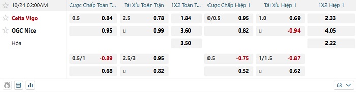 Tip kèo Châu Á hiệp 1 Celta Vigo vs Nice