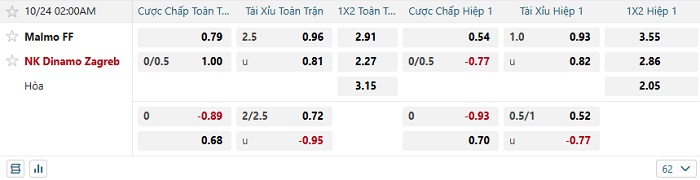 Tip kèo Châu Á hiệp 1 Malmo vs Dinamo Zagreb