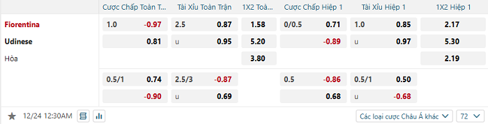 Tip kèo Châu Á full trận Fiorentina vs Udinese