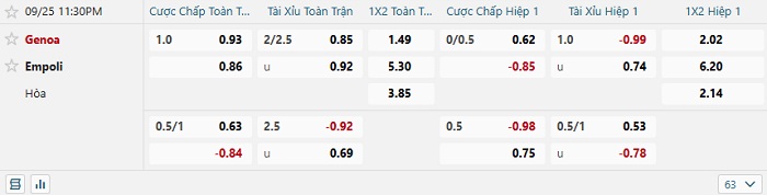 Tip kèo Châu Á hiệp 1 Genoa vs Empoli