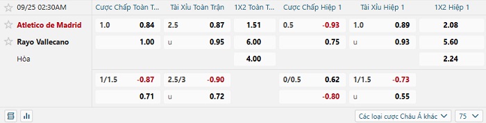 Tip kèo Châu Á hiệp 1 Atletico Madrid vs Rayo Vallecano