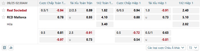 Tip kèo Châu Á hiệp 1 Sociedad vs Mallorca