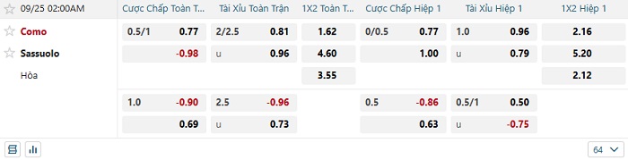 - Dự đoán tỷ số hiệp 1: Como 0 – 0 Sassuolo