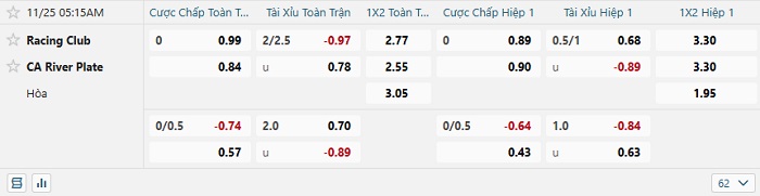 - Dự đoán tỷ số hiệp 1: Racing Club 0 – 0 River Plate