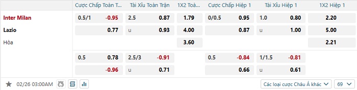 Tip kèo Châu Á hiệp 1 Inter vs Lazio