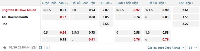 Tip kèo Châu Á hiệp 1 Brighton vs Bournemouth