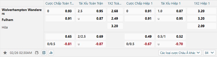 Tip kèo Châu Á full trận Wolves vs Fulham