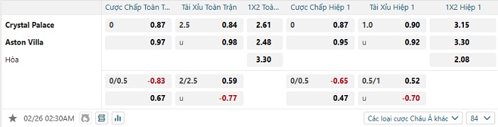 Tip kèo Châu Á full trận Crystal Palace vs Aston Villa