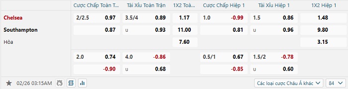 Tip kèo Châu Á full trận Chelsea vs Southampton