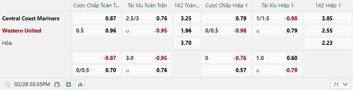 Tip kèo Châu Á hiệp 1 Central Coast vs Western United