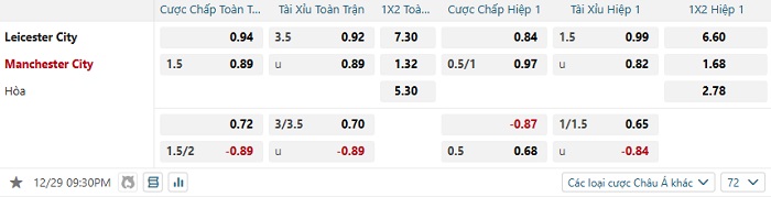 Tip kèo Châu Á full trận Leicester vs Man City