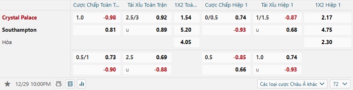 Tip kèo Châu Á hiệp 1 Crystal Palace vs Southampton