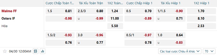 Tip kèo Châu Á hiệp 1 Malmo vs Osters