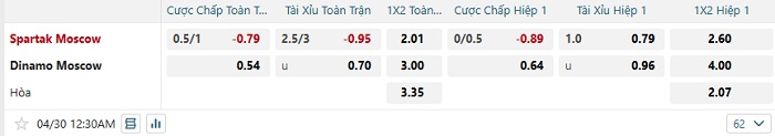Tip kèo Châu Á hiệp 1 Spartak Moscow vs Dinamo Moscow
