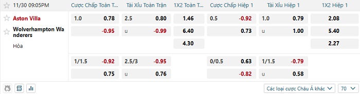 Tip kèo Châu Á full trận Aston Villa vs Wolves
