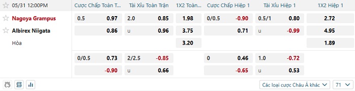 Tip kèo Châu Á hiệp 1 Nagoya Grampus vs Albirex Niigata