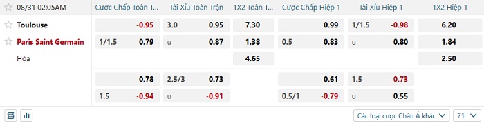 Tip kèo Châu Á hiệp 1 Toulouse vs PSG