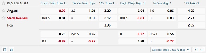 Tip kèo Châu Á hiệp 1 Angers vs Rennais