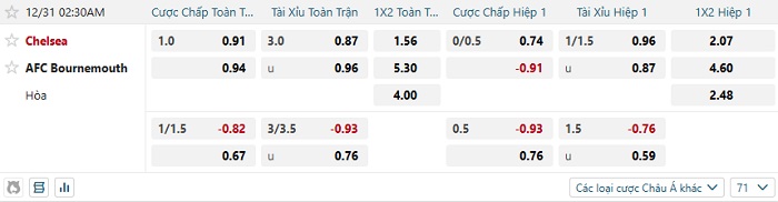 Tip kèo Châu Á full trận Chelsea vs Bournemouth