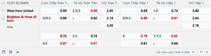 Tip kèo Châu Á full trận West Ham vs Brighton