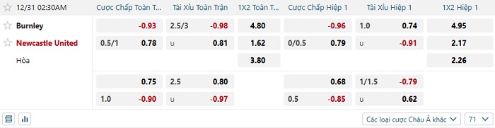 Tip kèo Châu Á hiệp 1 Burnley vs Newcastle