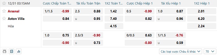 Tip kèo Châu Á hiệp 1 Arsenal vs Aston Villa