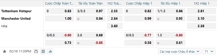 Bảng tỷ lệ kèo bóng đá Tottenham vs Man Utd